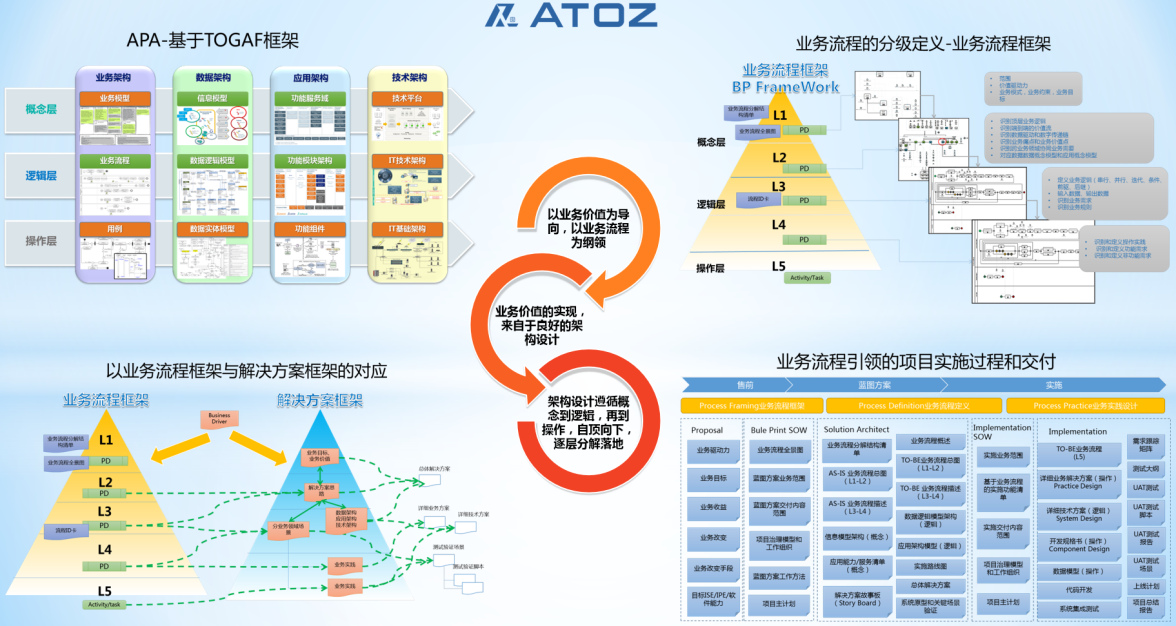 基于TOGAF四大架构(业务架构、数据架构、应用架构和技术架构),以及概念、逻辑、操作分层思想,APA方法实际操作中把业务架构细化为L1~L5五层定义结构,每下一层业务流程图都是对上一层其中一个业务活动的进一步细化和分解。数据架构、应用架构和技术架构在每个层面,对业务架构进行解决方案的权衡和迭代。