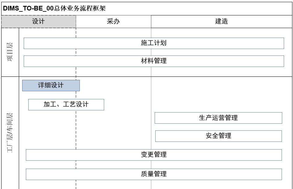 概念层(L1~L2):概念层业务流程图是对一个组织宏观的、全局的业务活动(或业务域)的定义,需要描述该业务在研制全生命周期的位置和持续的长度,以及所属的业务部门。其中L1是一张全景业务流程图,L2是对L1中业务域的进一步细化分解,可以是多张L2业务流程图。典型的L1/L2示例图如下。