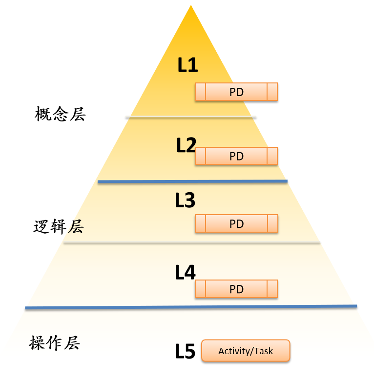 基于TOGAF的概念、逻辑、操作分层思想,APA方法实际操作中把业务架构细化为L1~L5五层定义结构,每下一层业务流程图都是对上一层其中一个业务活动的进一步细化和分解。本文中所定义的业务流程分解层级,按照下图所示的标准执行。