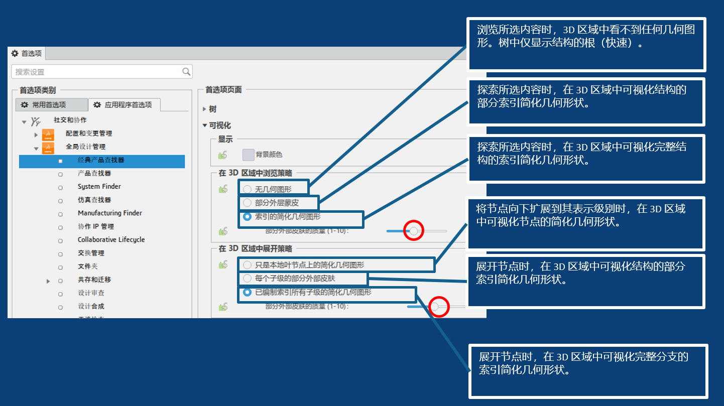 经典产品探索包含以下几方面的内容:导航对象结构、过滤内容以及在设计上下文中打开内容;导航对象结构(3D 缩略图);访问和管理有关树实体的信息;打开所需的内容(过滤、扩展等)进行更新。该模式还需要对CATIA进行相关的设置调整,设置选型的内容解释如下: