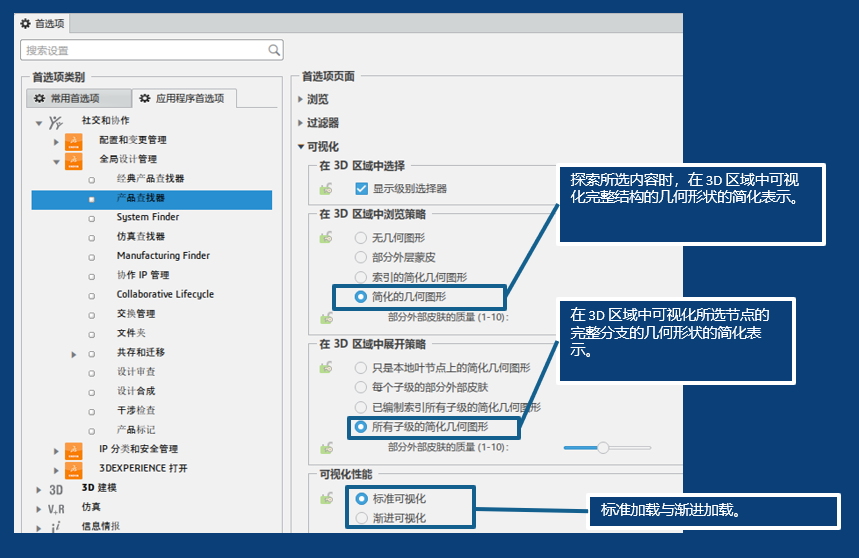 新的导航体验包含以下几方面的内容:这个概念类似于产品搜索应用程序,普通的产品搜索有一些差异;支持多根;标准加载与渐进加载;仅用于审阅,不适用于创作。该模式还需要对CATIA进行相关的设置调整,设置选型的内容解释如下: