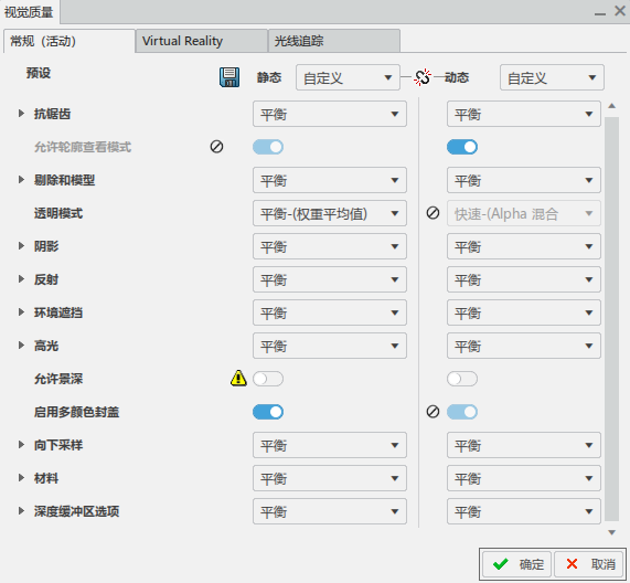 视觉质量设置通过预定义值或自定义可视化参数修改渲染性能和视觉质量。“快速”模式提供最佳实时性能;“超高”模式提供最佳视觉质量结果;“超高”模式是“实时渲染”的一个很好的设置。“静态”意味着与对象没有交互。“动态”意味着通过例如操纵器、旋转、缩放或动画来修改视点。