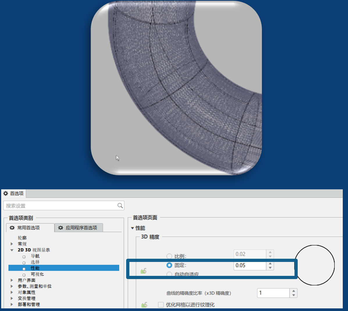 当处于“编辑”模式下时,精度选项用于控制曲面的网格。“网格”表示几何图形的曲面使用三角形来构建。将会计算出一个三角形,以便描述所有点的相邻关系。设置固定弦高值(从 0.01 到 10),以计算所有对象的网格。