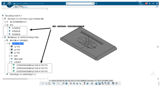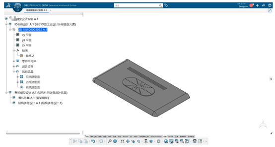 基于骨架设计的好处就是便于研发过程中的模型调整。我们模拟了ID外形工程师由于某些原因调整了整机的宽度尺寸,此时由于结构件专业内部的背板和后壳均基于ID外形发布的骨架进行带链接设计,因此当激活结构树根节点并更新连接关系以后,可以观察到设计结果中的模型也会自动更新,这种基于同一结构树进行的全专业协同设计,是3DE平台的专有优势。