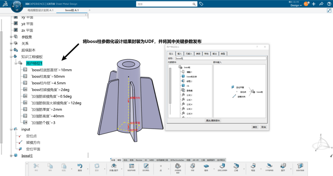 特征的模板化牵扯到的概念较多,这里我们不过多赘述。一般而言,公司级别的特征模板创建,建议设置为UDF或者工程模板。UDF用于封装特征级别的模板,而工程模板用于封装零件或者装配级别的模板。此处以UDF为例,将BOSS柱绘制为参数化模型,封装时设置好输入条件: