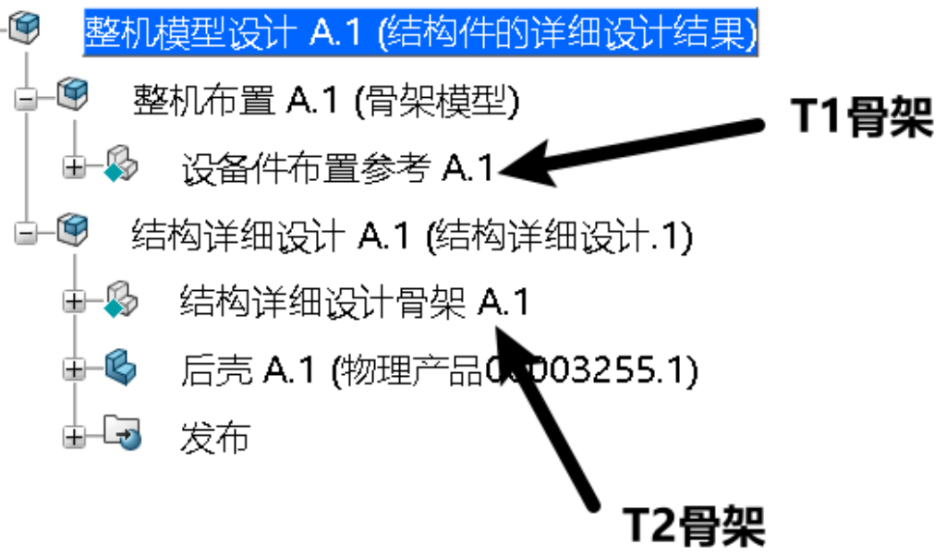 T1骨架属于总布置工程师角色,此节点承接了ID外形拆件后的发布元素,并在其基础上规定了整台电子类产品模型的全部关键尺寸、及各专业之间配合的关键位置和配合样式。T1骨架发布后,各专业详细设计引用,并基于此进行细化,创建属于各专业内部的详细设计骨架,这里我们称之为T2骨架。这样可以保证各专业内部的建模严格遵循“自顶向下”,同时又保证了专业之间的配合在总布置工程师所有权下,避免不必要的无效沟通降低研发效率。数据之间的传递流如下图所示: