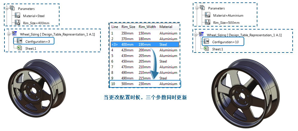 例如:我们继续以这个轮毂模型为例子,将轮辋尺寸Rim_Size、轮辋宽度Rim_Width以及轮毂的材质Material的参数用一个设计表来驱动,配置Configuraiotn是对应于设计表中的一行的一组参数值,当更改配置时,三个参数会同时更新。