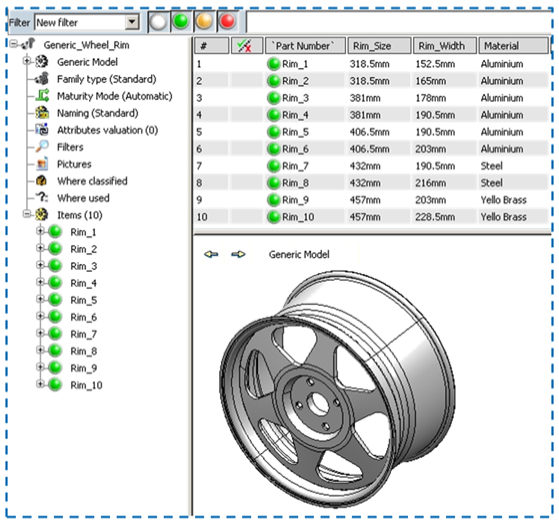 部件系列是一个对象,允许以简单友好的方式生成和管理一系列借助设计表从常规参数定义派生的物理零件或装配体参考,并且每个元素的常规参数定义均不同。生成操作可按需执行,并且通过目录应用程序将系列元素提供给最终用户。产品表类似于设计表的思路,设计表和产品表之间的主要区别为:使用产品表可以处理产品,而使用设计表只能处理零件。