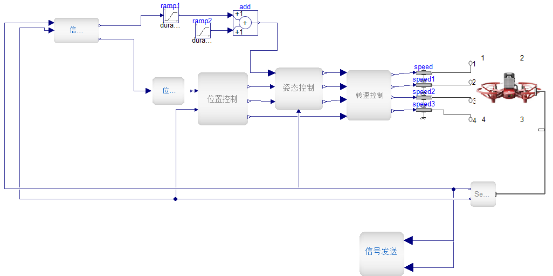 虚拟无人机模型(Dymola构建)如图3所示,接收控制指令和发送运动信息由通信接口模型(Dymola构建)向控制中心和视景软件(FlightGear)传递,如图4所示;