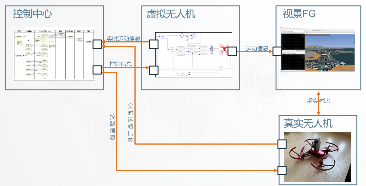 在控制中心(CATIA Magic构建)构建无人机任务过程,应用安托开发的通信插件,在任务执行过程中同时将控制指令发送给虚拟无人机(Dymola构建)和真实无人机,虚拟无人机和真实无人机指令执行完成后会反馈给控制中心;