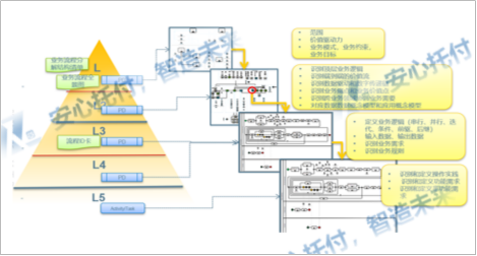 为更好的挖掘和分析业务,在项目中采用安托APA方法论来进行整个项目的推进工作。APA工作方法是基于TOGAF框架形成的安托的特有工作方法,颇受已合作客户的认可,并被客户采用于内部的更多业务工作的展开。APA工作方法强调以业务价值为导向,以业务流程为纲领,从概念到逻辑,自顶向下,逐层分解落地。在项目实施过程中,为保持客户对项目推进工作的一致理解,项目组特别安排公司首席业务方案架构师给客户业务人员和项目组全体成员进行了深入培训。如下图所示为基于APA的业务流程分级示意: