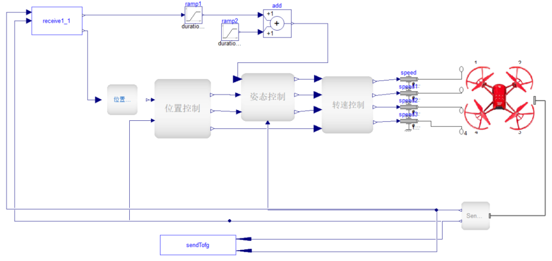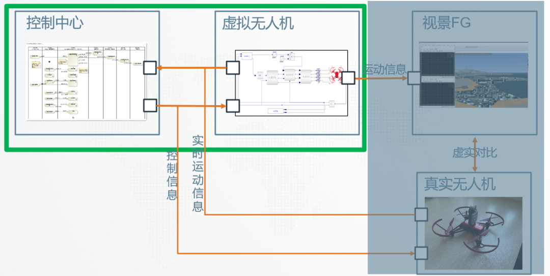 某装备研究院无人机战场侦察联合仿真:模拟无人机从战备起飞、发现目标、执行攻击到安全返航的侦察攻击过程,为了确保验证的有效性和准确性,虚拟无人机与真实无人机同时执行任务,虚实结合对比,不断提高虚拟无人机的仿真精度,在达到一定的精度后,可以利用虚拟无人机单独开展仿真验证,进而形成数字孪生体,利用虚拟验证进行系统行为预测和优化,减少物理样机试验次数或取而代之(降低成本),本次探索仅进行控制中心和虚拟无人机的联合仿真。