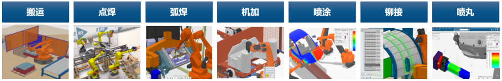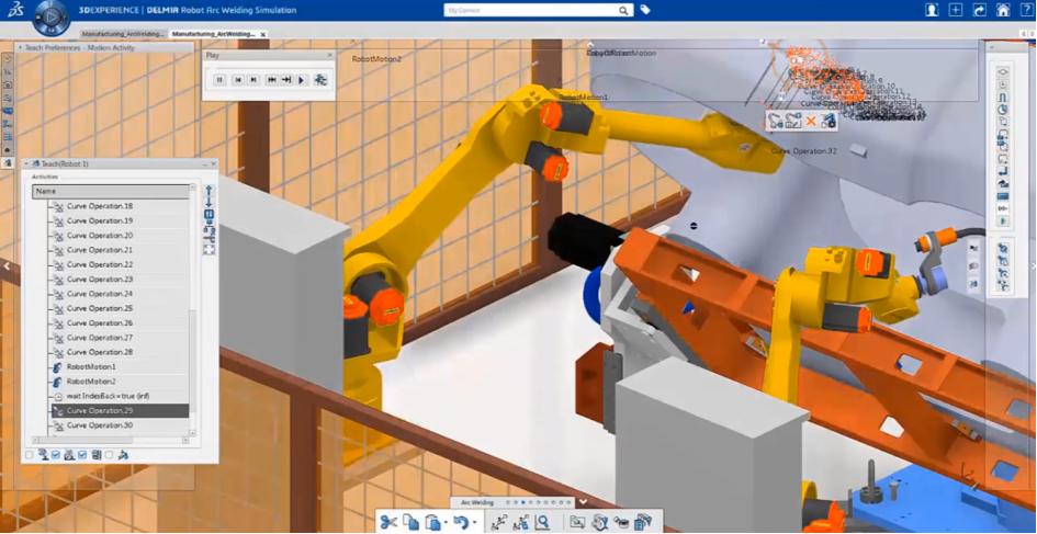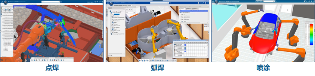 3DEXPERIENCE平台提供了一个集成的虚拟环境高效地进行编程、仿真并优化工业机器人的行为和任务,同时所有仿真过程基于统一的三维沉浸式环境完成。平台内包括超过1500多种工业机器人模型和标准焊枪,具备搬运、点焊、弧焊、机加、喷涂、铆接、喷丸等多样性专业作业仿真能力,工程师可以基于特定作业类型非常快速的进行机器人的离线编程和仿真。