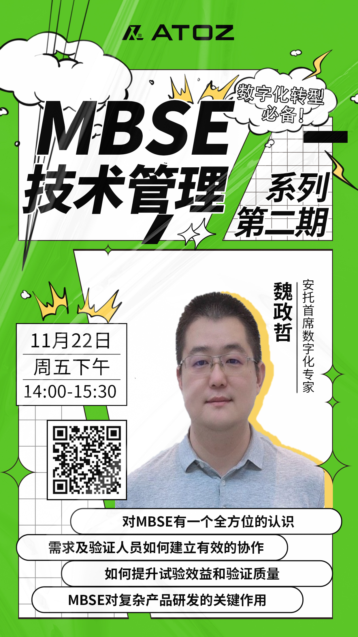 欢迎您参加“基于模型的系统工程(MBSE)技术管理专题”线上培训。本培训围绕模型在工程研制及产品开发中的管理应用,分为需求、试验、方法论三个主题。第二期培训将于【11月22日本周五14:00】举行,旨在帮助企业在数字化转型过程中提升试验效益和验证质量。