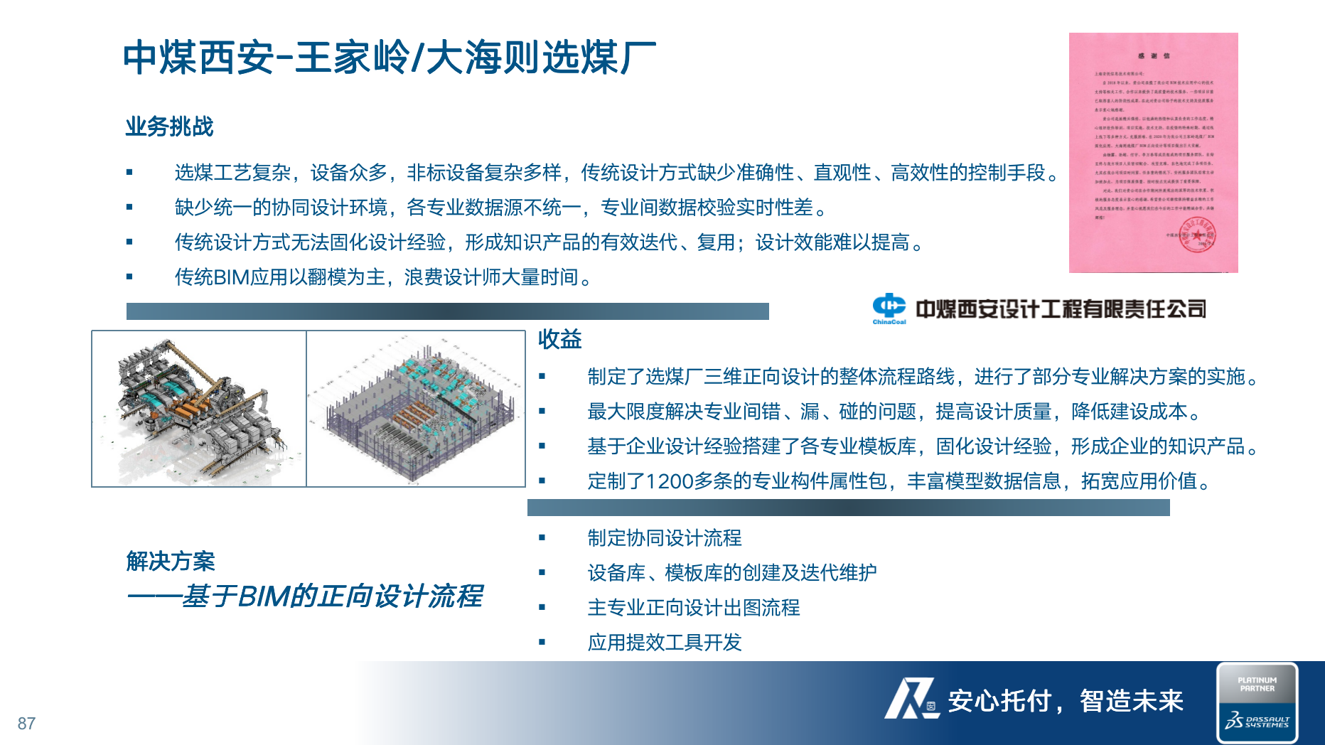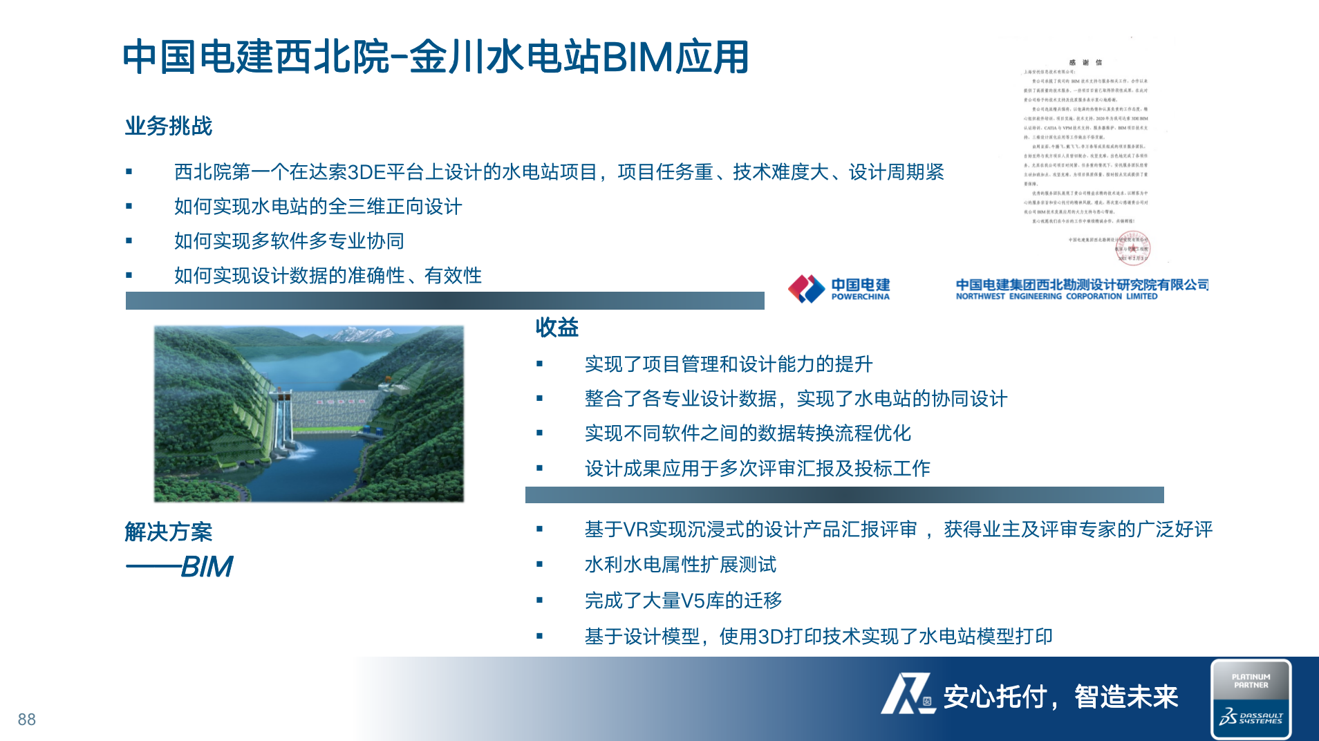 电建西北院与安托的本次合作将依托电建西北院丰富的工程行业实践经验,以及安托公司在信息化、数字化多年服务经验,充分整合达索行业内外优势技术研发资源,深入挖掘达索3DE平台各板块原生态功能,重点以数字化设计需求为切入点,基于达索平台研发高度契合水利水电工程全生命周期BIM应用需求的整体解决方案,为水利水电工程规划、设计、施工、移交、运维各阶段提供技术支持、服务及专业化的软件平台开发和产品。其中包括技术咨询、产品研发及销售和行业教育培训认证。基于达索3DE平台及研发的相关专业软件平台产品,提供工程相关企业三维数字化发展规划及策略咨询、设计BIM咨询、施工BIM咨询、智慧工程、一体化项目管控、数字移交、智慧运维等技术支持服务,为客户提供“一揽子”解决方案,快速提升基于达索3DE平台的BIM及数字化应用技术水平及管理模式。