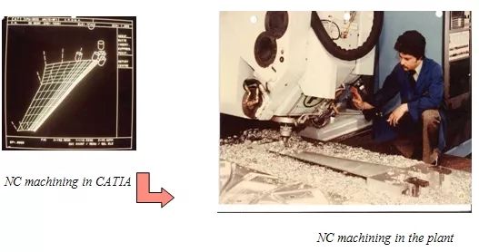 在60年代后期,我们在制造工厂安装了第一台数控(NC)机器。这些机器用于在厚实心铝块中雕刻出最复杂的飞机结构部件。特别是对于军用飞机来说,要求用最轻的结构获得最佳性能 。根据复杂零件形状的CAD定义,我们开发了一个软件来定义机床的路径,然后下载这些信息来驱动数控机床。这是计算机辅助制造(CAM)的诞生。