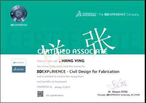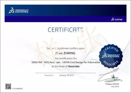 在通过达索系统大中华区认证考试后,可申请参加达索系统的全球认证考试,通过后由达索系统(法国总部)颁发3DEXPERIENCE平台土木工程行业认证证书,下图为全球认证证书样张: