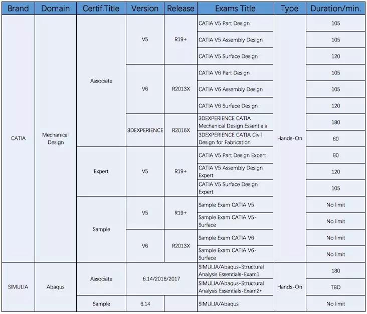 目前达索系统全球认证在中国可以进行的考试目录如下: