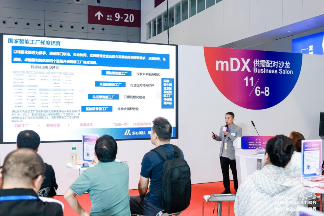 活动期间,安托业务咨询顾问张坤在两场mDX供需配对沙龙上为观众带来了聚焦智能工厂梯度培育的场景化转型方案介绍。针对需求方普遍面临的痛点,通过数字化设计与交付平台及技术,能够显著缩短工厂建设或改造周期;利用数字孪生工厂构建,实现数据管理与模型映射交互,提升管控效率;借助产品数字化设计的工具、知识库与多技术集成,以及人工智能大模型创新,助力企业缩短产品研发上市周期、降低成本。