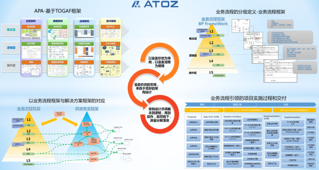 整体上业务流程框架从宏观到微观,逐步拆解、设计业务流程,让复杂业务有清晰梳理和落地路径。APA(ATOZ Process Approach)的书中关于“APA(ATOZ Process Approach)架构设计”的业务架构设计章节会详细介绍业务架构定义的全过程。