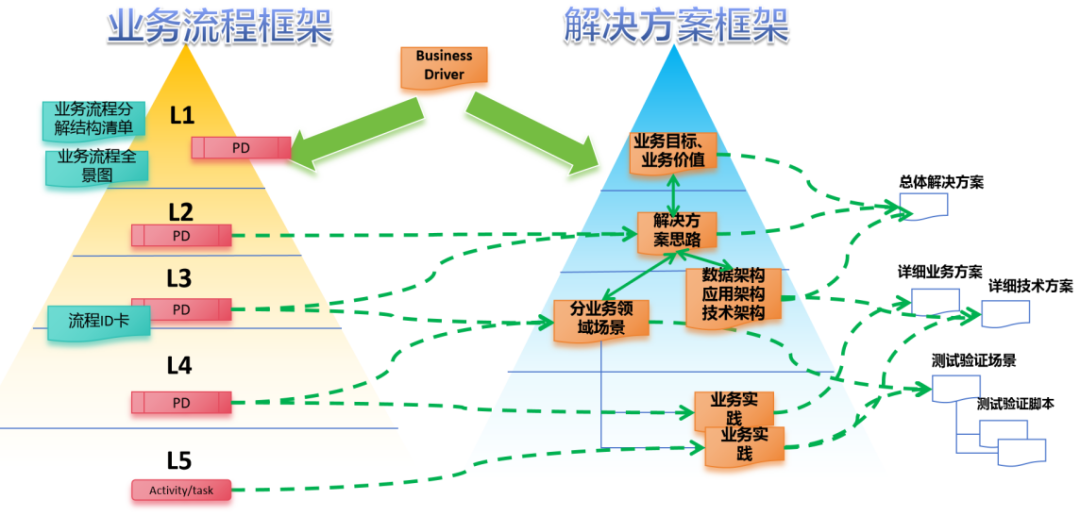左侧(业务流程框架):按 L1 - L5 层级,从宏观(业务流程分解清单、全景图 )到微观(Activity/Task ),用流程ID卡对每一个在业务流程框架中被识别的业务流程进行概述定义,用PD(Process Description)完成对各级业务流程的详细定义,“业务驱动力(Business Driver)”是业务流程框架、业务流程和解决方案的共同源头。