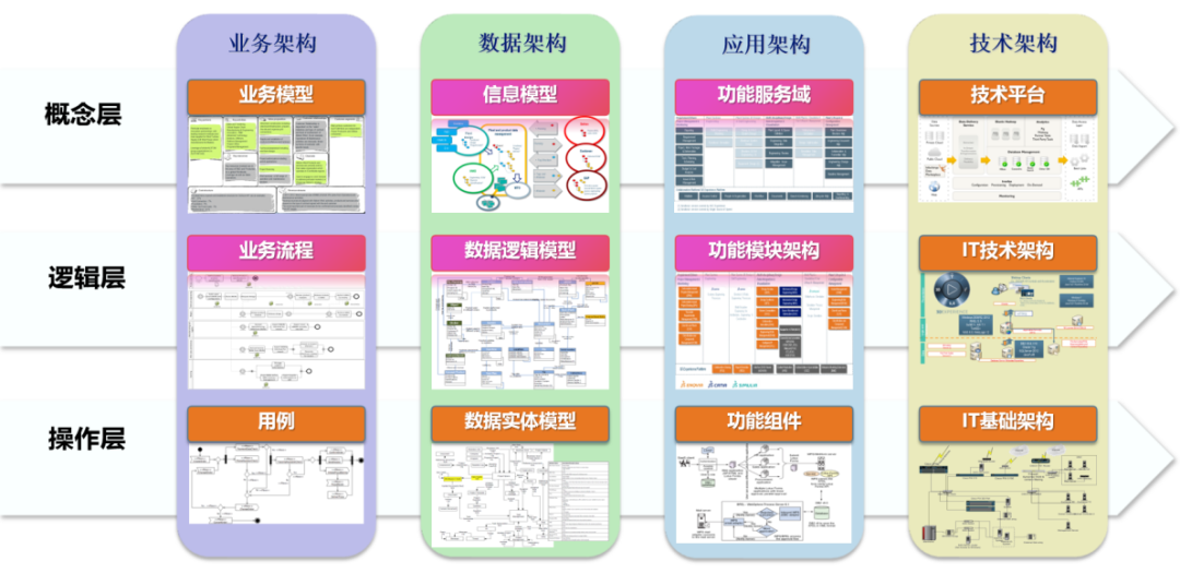 概念层(L1-L2):用“业务流程分解结构清单、业务流程全景图”,梳理业务框架,明确价值动力、业务模式等宏观内容,定业务大方向。