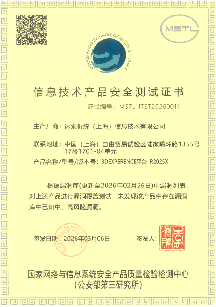 达索系统3DEXPERIENCE 平台 R2025X 版本现已正式通过全部严格测试,并获得了由国家网络与信息系统安全产品质量检验检测中心颁发的《信息技术产品安全测试证书》 【 证书编号 MSTL-ITST202600111 】